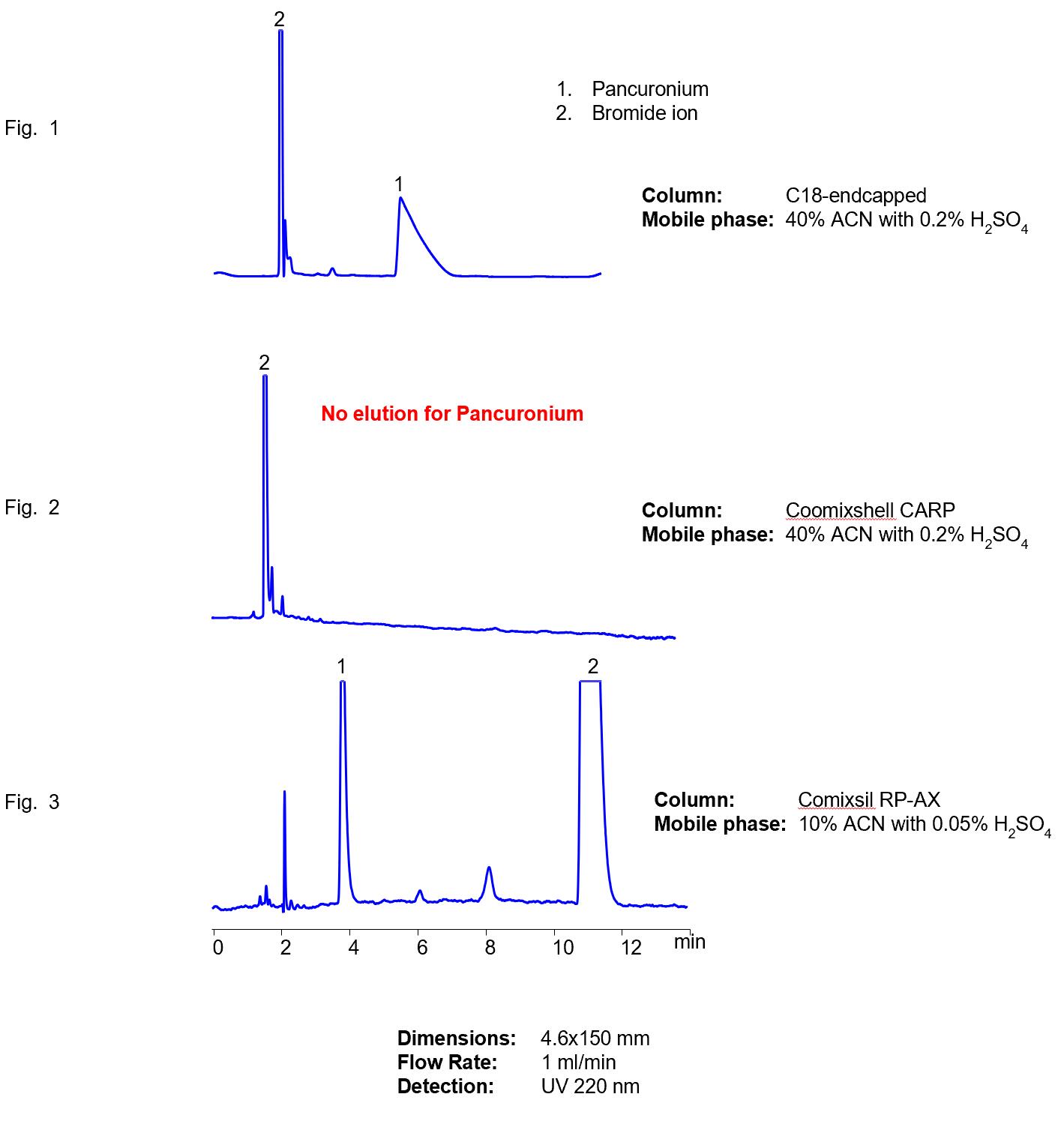 Mixed-mode chromatography usually adds secondary and tertiary interactions which help to achieve controlled retention, unique selectivity and allow to adjust retention time of various compounds by changing the amount of organic, buffer concentration, buffer pH and buffer nature(混合模式色譜法通常增添二重和三重相互作用,有助于實(shí)現(xiàn)可控的保留,獨(dú)特的選擇性,并通過(guò)改變有機(jī)溶劑的含量,緩沖濃度,緩沖pH值和緩沖鹽的性質(zhì)來(lái)調(diào)整各種化合物的保留時(shí)間。 ). Presence of ionizable groups on the column also helps improve peak shape for various analytes, which sometimes is impossible to achieve with single mode columns.(色譜柱上存在可電離基團(tuán)也有助于改善各種分析物的峰形,一些時(shí)候,這在單一模式色譜柱上是不可能實(shí)現(xiàn)的) Pancuronium bromide is a hydrophobic compound with two strong basic groups. It shows a poor peak shape when RP columns are used(泮庫(kù)溴銨是一種具有兩個(gè)強(qiáng)堿性基團(tuán)的疏水化合物。當(dāng)采用RP柱時(shí),峰形較差。). The poor peak shape is attributed to secondary interaction between analyte and silanols on the surface of RP columns (分析物與在RP柱表面的硅烷醇二次相互作用導(dǎo)致峰形較差) (Fig. 1). Sometimes you need to understand what secondary interaction to add to improve your chromatography(有時(shí),你需要了解增加什么樣的二次相互作用來(lái)改善你的色譜方法). In case of pancuronium bromide, addition of cation-exchange mechanism did not work and target compound never eluted, (Fig. 2) even with very strong mobile phase from the column due to three strong interactions (reversed-phase and two cation-exchange interactions)(在泮庫(kù)溴銨的例子下,添加陽(yáng)離子交換機(jī)制不起作用,目標(biāo)化合物也沒(méi)有洗脫(圖2)。即使柱內(nèi)流動(dòng)相洗脫能力很強(qiáng),存在三種強(qiáng)烈的相互作用(反相作用和兩種陽(yáng)離子交換作用),化合物也沒(méi)有得到保留.)Problem of elution and peak shape was addressed by changing cation-exchange interaction to cation-exclusion interaction. This allowed to retain and analyze both the drug and counterion with simple isocratic conditions (Fig. 3)(通過(guò)將陽(yáng)離子交換相互作用轉(zhuǎn)變?yōu)殛?yáng)離子排斥相互作用,解決了洗脫和峰形問(wèn)題。這樣就可以在簡(jiǎn)單的等度條件下保留和分析藥物和反離子).