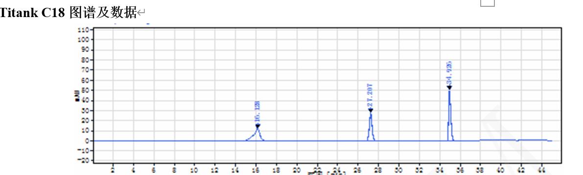 而本方法中更是使用了 100%水相 ,使用 TitankC18 與其他品牌色譜柱對比,發(fā)現(xiàn) TitankC18 色譜柱峰型及壽命 優(yōu) 于 其 他 品 牌 色 譜 柱 。 該 流 動 相 體 系 適 合 轉(zhuǎn) 換 成 LC-MS 檢 測 。