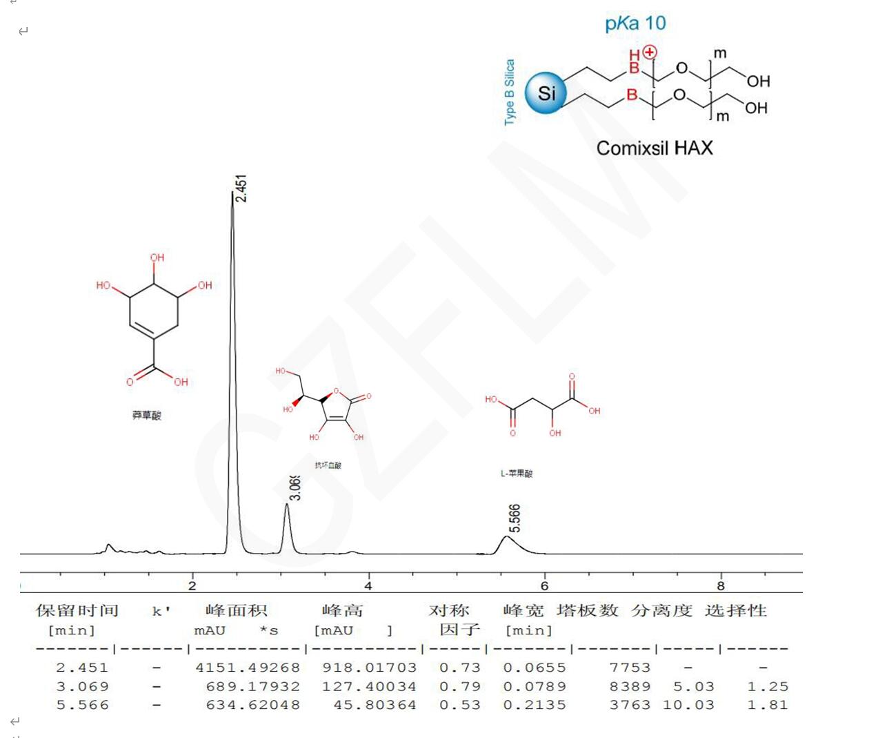 方法說(shuō)明:使用 Comixsil HAX 是陰離子交換+HILIC 混合模式,對(duì)莽草酸、抗壞血酸、蘋(píng)果酸三個(gè)有機(jī)酸進(jìn)行保留并分離,蘋(píng)果酸具有雙羧基結(jié)構(gòu),保留較強(qiáng)。
