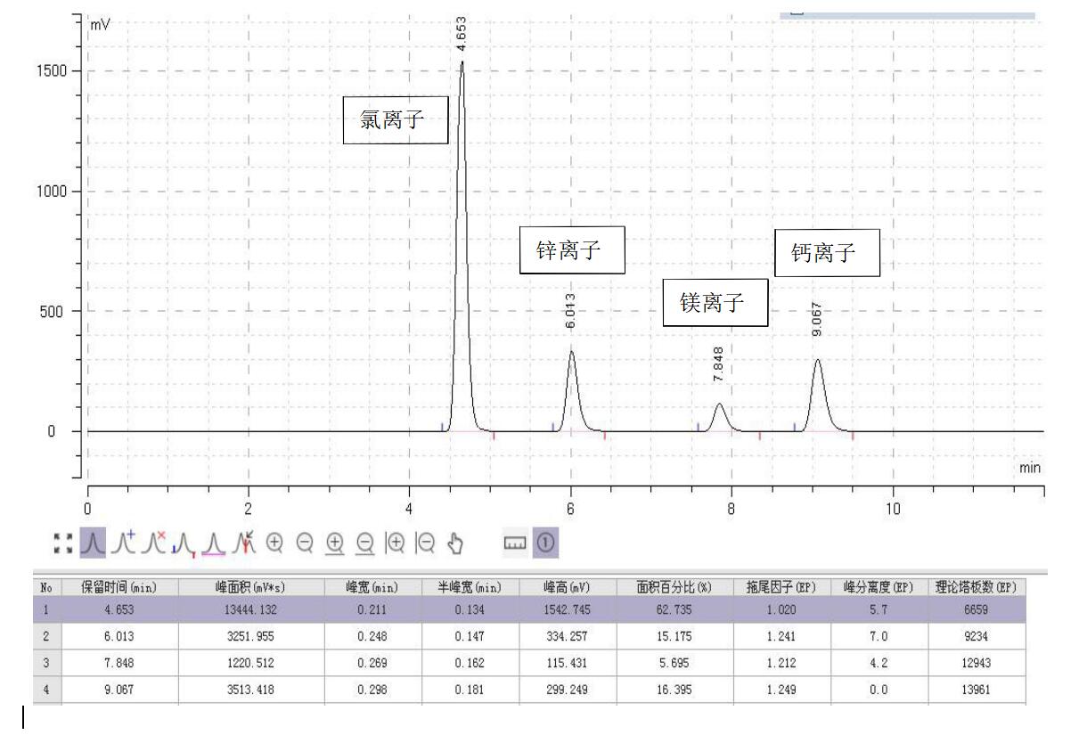 方法說明:上述圖譜采用氯化鋅、氯化鎂、氯化鈣做標(biāo)品,溶劑為 0.1%鹽酸溶液(若采用其它溶劑,鋅離子無法正常出峰),峰型受鹽濃度影響,鹽濃度高峰型好,保留時間受緩沖鹽 pH 及有機(jī)相比例影響。