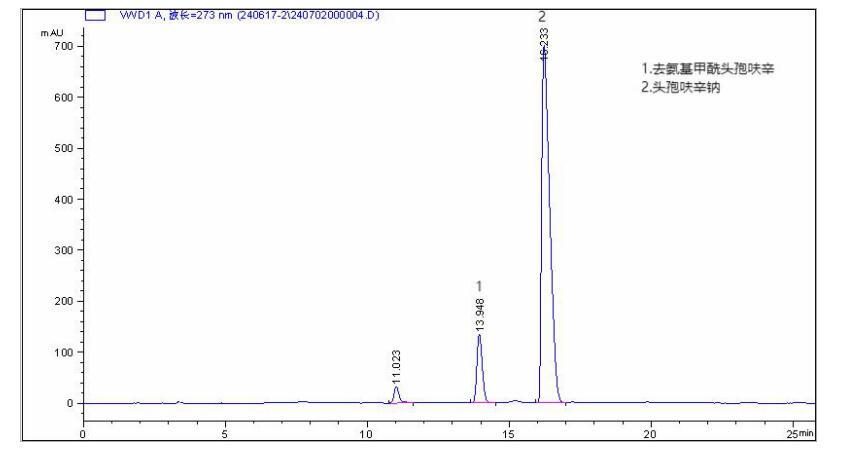 1. **系統(tǒng)適用性**: - 頭孢呋辛峰與去氨甲酰頭孢呋辛峰之間的分離度均大于**3.0**。 - 頭孢呋辛峰與后相鄰雜質峰間的分離度均大于**2.0**。 - 這些參數(shù)均符合中國藥典的測試要求,為頭孢呋辛鈉藥物的質量保證提供了可靠的檢測依據(jù)。
