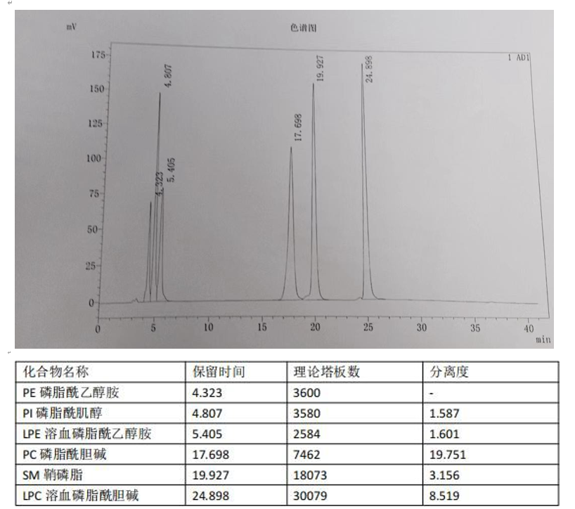 A 相:甲醇-水-冰醋酸-三乙胺(85∶15∶0.45∶0.05) B 相:以正己烷-異丙醇- 流動相 A(20∶48∶32) 各成分分離度應(yīng)符合要求,理論板數(shù)按磷脂酰膽堿峰、磷脂酰乙醇胺峰與磷脂酰肌醇峰計算均不低于 1500。 ![]() |