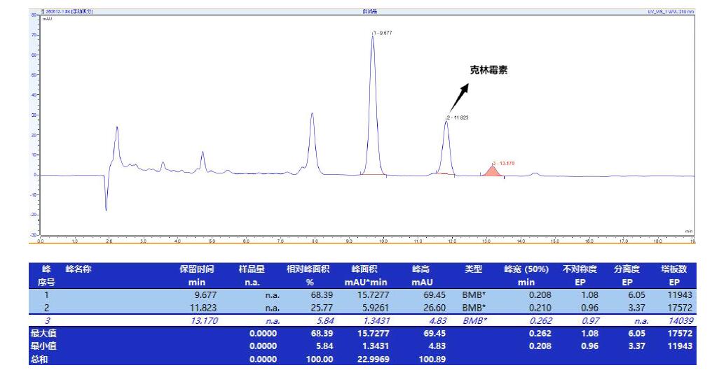 App ID: FLM-T250004 Titank C18 Plus 柱對克林霉素的檢測 色譜柱:Titank C18 Plus 5μ 250*4.6mm(貨號:FMG-0060-EONU) 流速:1 mL/min 檢測:UV210nm 柱溫:40oC 樣品濃度:1 mg/mL 進樣量:20 μ 溶劑:N/A 流動相:磷酸二氫鉀溶液(每1mL 中含磷酸二氫鉀6.8mg,用25%的氫氧化鉀溶液調(diào)節(jié) pH 值至7.5)-乙腈(55:45) 色譜圖: