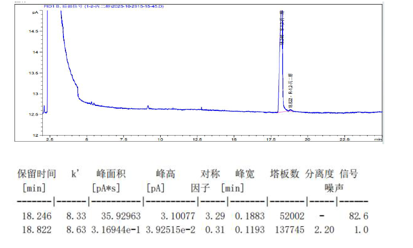 App ID: FLM-F250002 FBX-DEX DET Gamma 氣相手性柱對(R,S)-1,2-丙二醇的手性分離 色譜柱:FBX-DEX DET Gamma 30m×0.25mm×0.25μm 貨號:GDET-025-025-30 色譜條件:咨詢 樣品:(S)-1,2-丙二醇和(R)-1,2-丙二醇,甲醇稀釋為濃度0.1%樣品 進樣量:0.04μL 色譜圖(1):S 構型先出峰,R 構型后出峰,分離度2.88。R 與S 1:1 配比