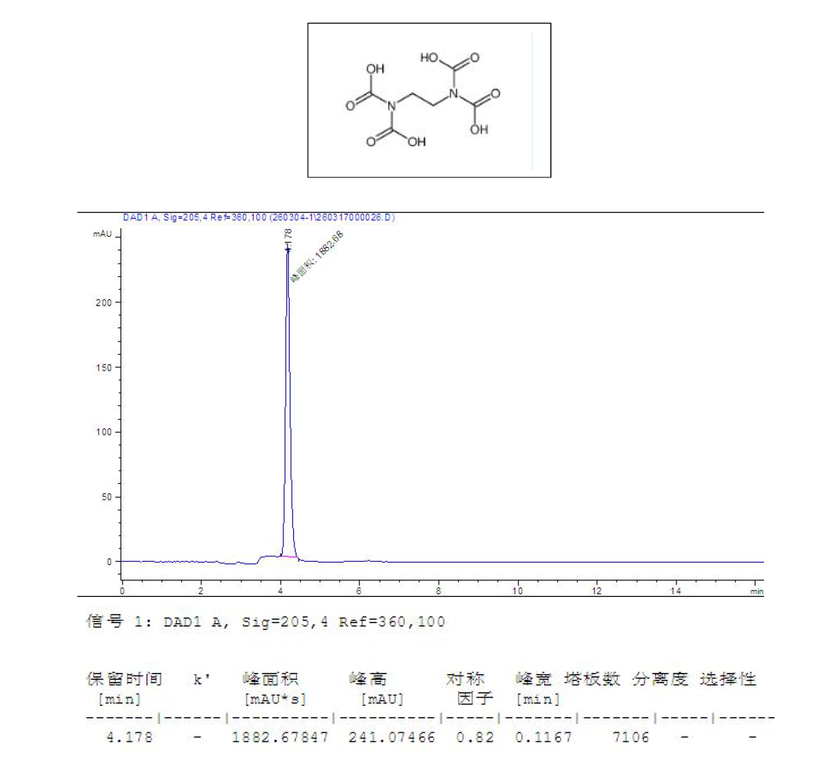 App ID: FLM-T260001 Titank C18 柱對EDTA 的檢測 方法:自定 色譜柱:Titank C18 5μ 250×4.6mm 貨號:FMG-5560-EONU 流速:1 mL/min 檢測:UV205nm 樣品濃度:1 mg/mL,溶劑:水,進樣量:2 μ 流動相:0.1%磷酸水溶液 色譜圖: 說明:EDTA 作為藥物輔料中常見成分,Titank C18 雜化硅膠固定相,可在純水相條件下實現(xiàn)快速分析, 柱效良好。 ![]() |