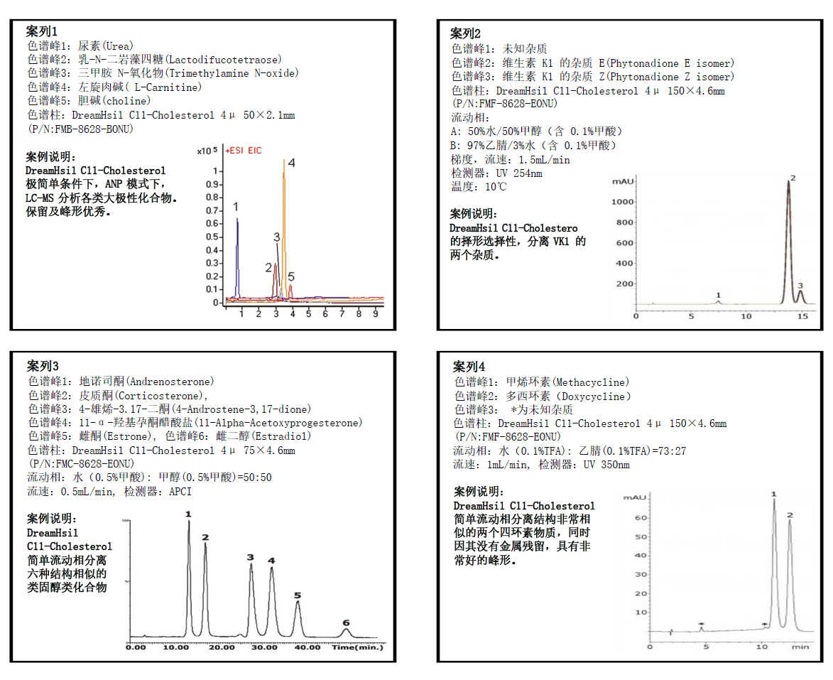 - DreamHsil C11-Cholesterol 色譜柱 C11-Cholesterol具有非常獨(dú)特的選擇性。采用獨(dú)特鍵合技術(shù),將固定相直接獨(dú)立的單點(diǎn)鍵合于Si-H鍵上直接形成Si-C鍵的C11-Cholesterol鍵合相。