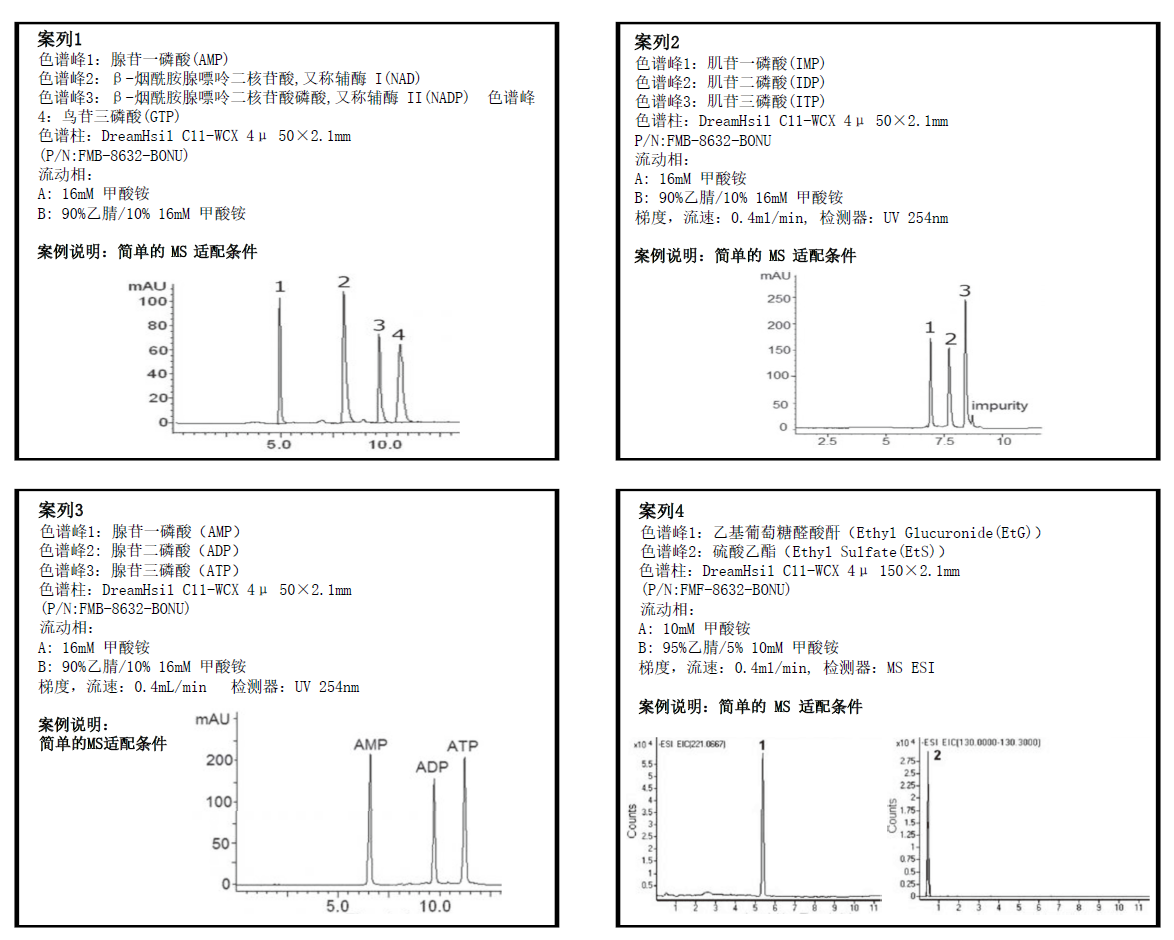 當(dāng)流動(dòng)相的pH高于6時(shí),羧基 90%電離成帶負(fù)電基團(tuán),而PH在6.9以上時(shí),幾乎全部電離,此時(shí),可以主要考慮它的陽離子交換作用。 DreamHsil C11-WCX 色譜柱是分析人員用LC-MS分析相似物質(zhì)時(shí)的一個(gè)好選擇。